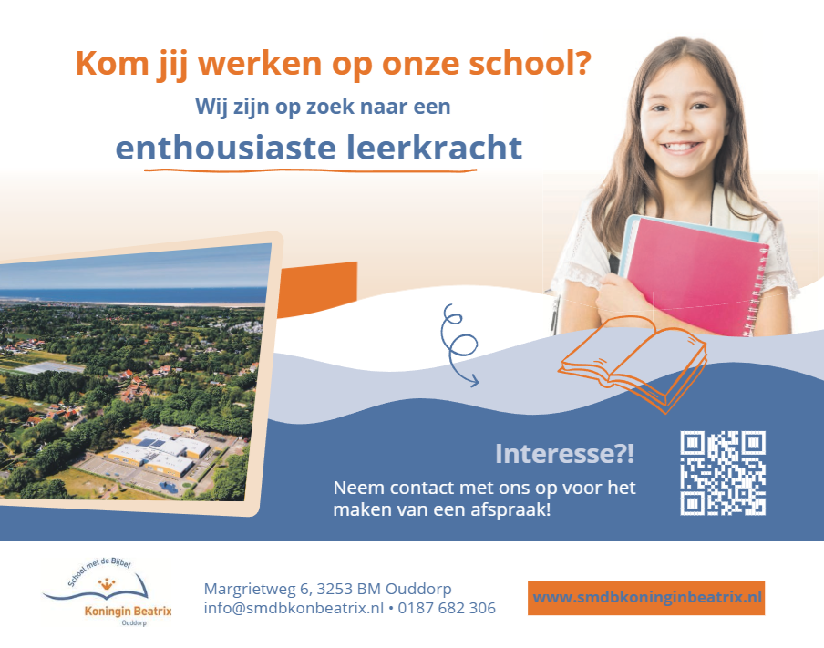 Voor onze basisschool in Ouddorp zoeken we een enthousiaste groepsleerkracht. Dit kan parttime of fulltime ingevuld worden. Je komt terecht in een betrokken en gedreven team dat samen bouwt aan onderwijs dat écht het verschil maakt.